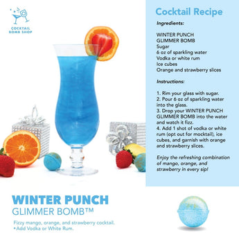 Winter Punch Bomb bursts with the vibrant flavors of mango, orange, and strawberry, capturing the essence of a tropical getaway during the cooler months. This cocktail bomb provides a juicy, refreshing blend that's perfect for enjoying as a lively mocktail. It excels in its ability to deliver a burst of summer with every sip, thanks to its rich mango base complemented by the citrusy zing of orange and the sweet charm of strawberry. When mixed with alcohol, it pairs brilliantly with white rum, enhancing the tropical fruit flavors, or with a splash of vodka for a crisp, clean taste. Ideal for those seeking a festive and fruity drink to brighten up the winter season.