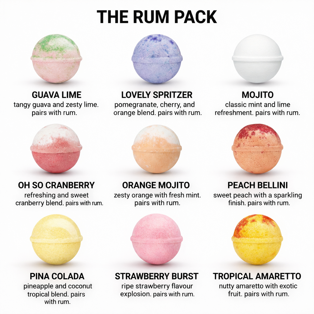 Bring vacation vibes to your glass with our brand new Rum Pack, featuring 9 rum-inspired cocktail bombs. From creamy Piña Colada to fresh Mojito, this tropical collection is bursting with bold, fruity, and refreshing flavors made to pair perfectly with rum.