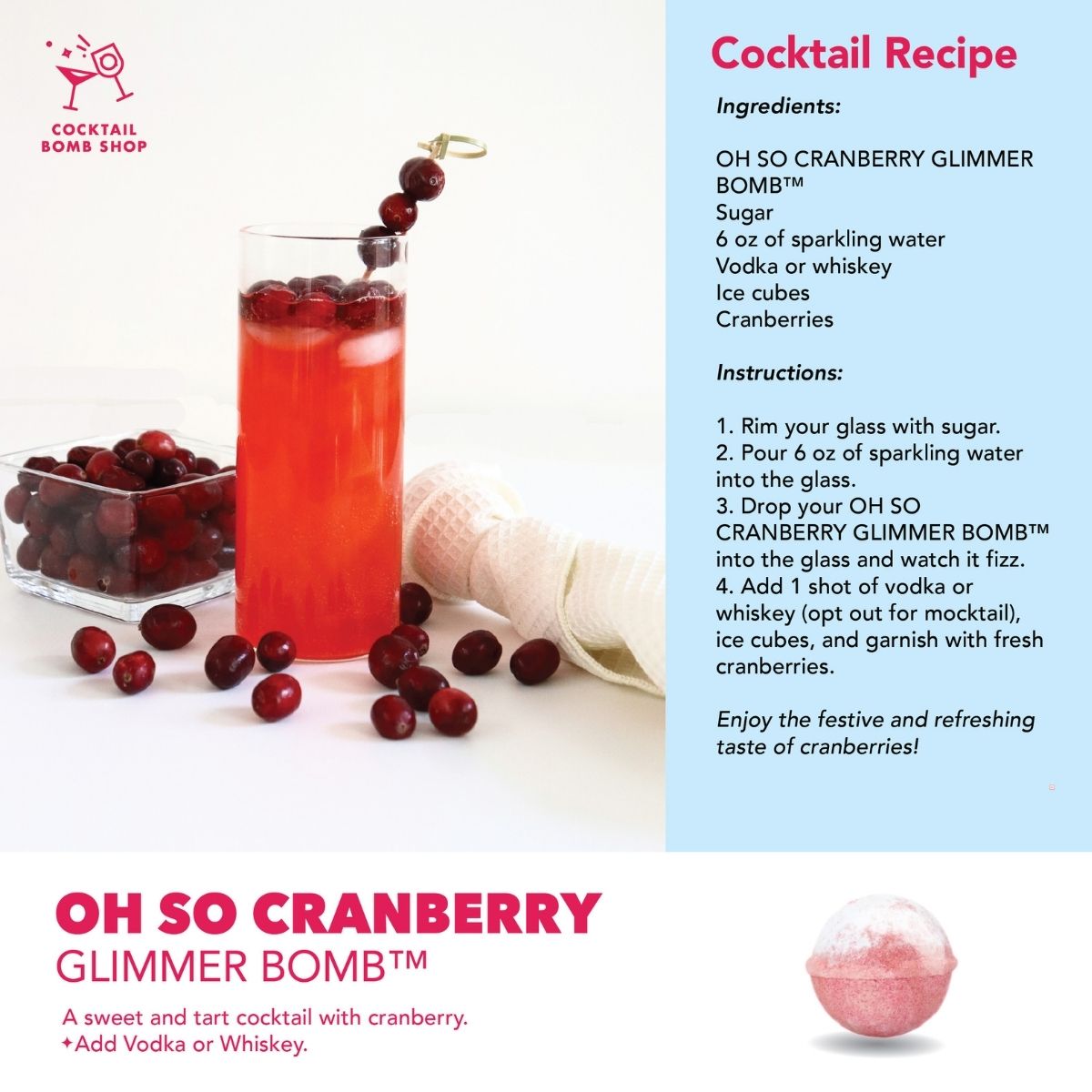 Bright cranberry flavour shines in this vibrant jar of 30 handcrafted cocktail bombs, transforming sparkling water into a crisp, berry-forward sip with the perfect balance of tartness and smooth sweetness.