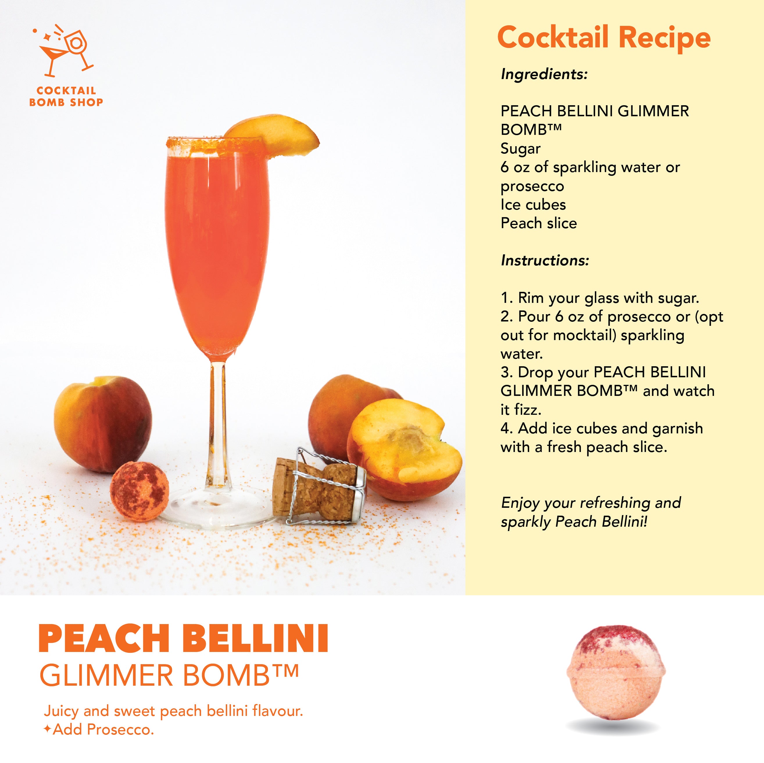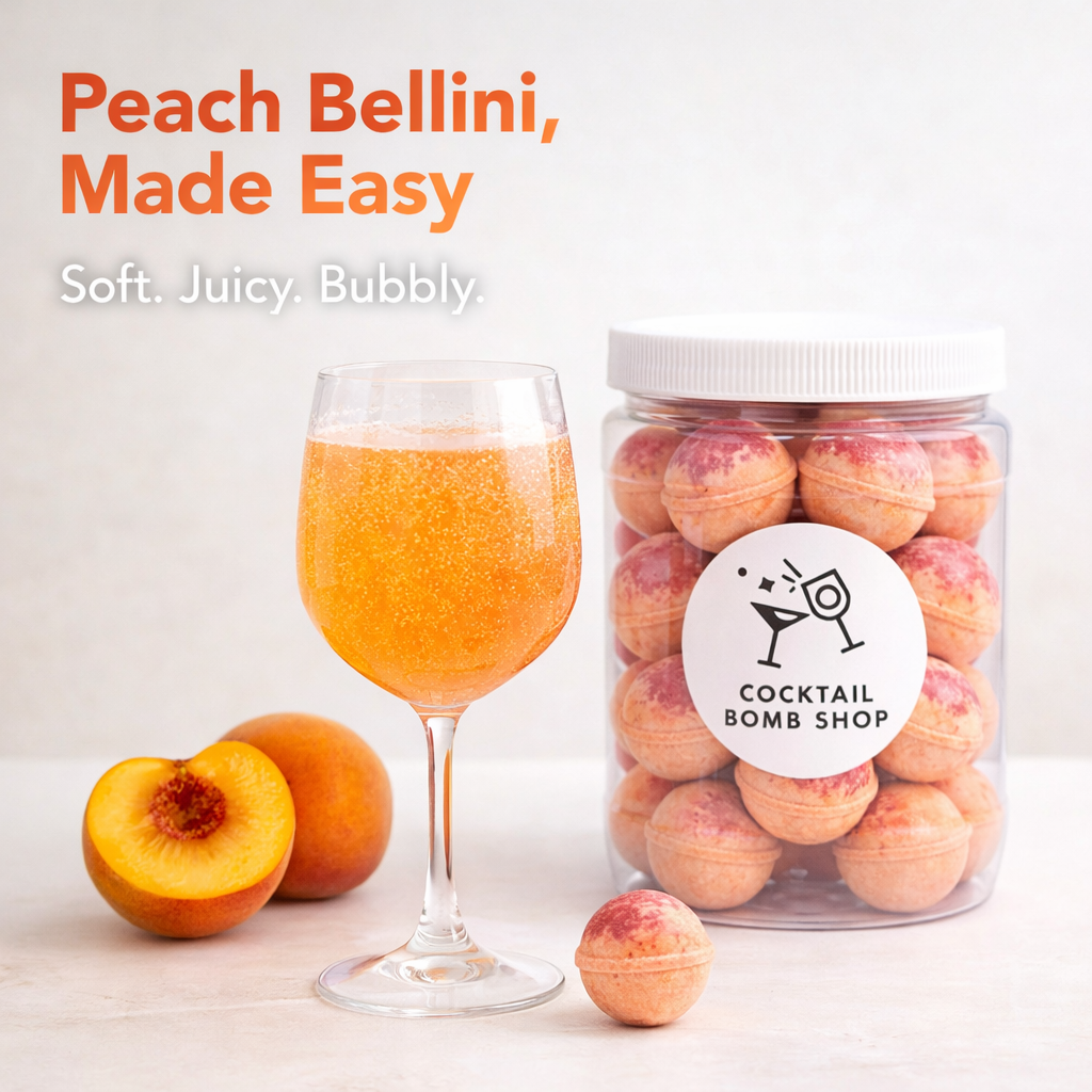 Sweet, juicy peach takes center stage in this refined jar of 30 handcrafted cocktail bombs, turning sparkling water into a light, peach-forward sip with classic bellini charm and a delicate bubbly finish.