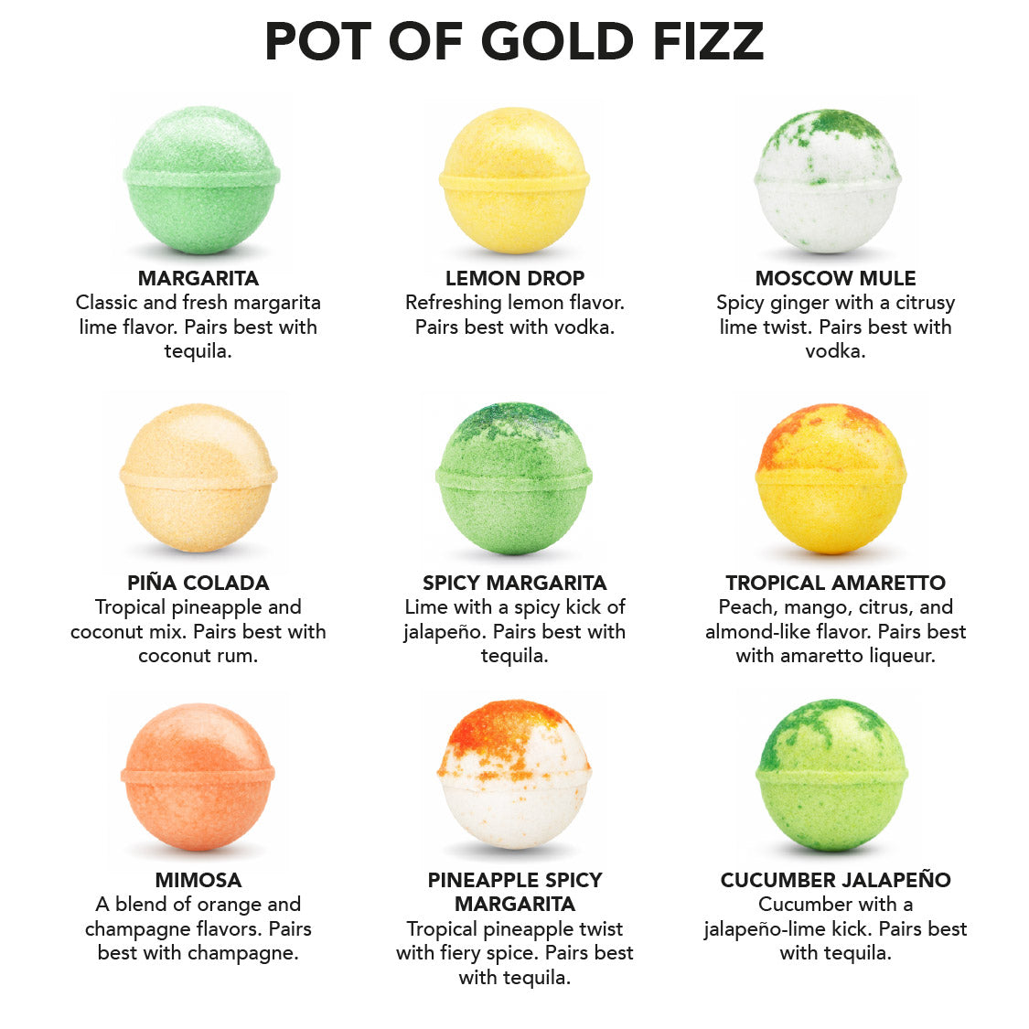 Celebrate St. Patrickβs Day with the Pot of Gold Fizz Discovery Jarβ’, a festive collection of handcrafted cocktail bombs bursting with bright citrus, juicy fruit, and refreshing flavours. Inspired by lucky charms and golden moments, each fizz adds vibrant colour and playful sparkle to your glass.