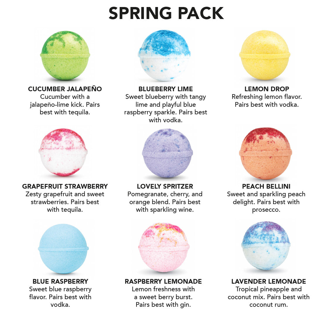 Celebrate the season with the Spring Packโข, a bright collection of nine handcrafted cocktail bombs inspired by blooming florals, juicy fruits, and crisp citrus flavours. Light, refreshing, and beautifully vibrant, each flavour captures the feeling of longer days and warmer weather.